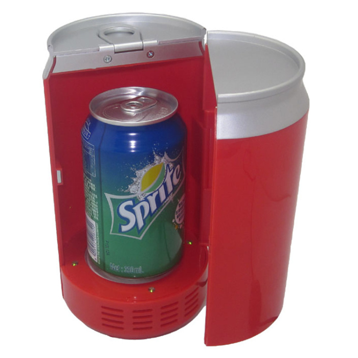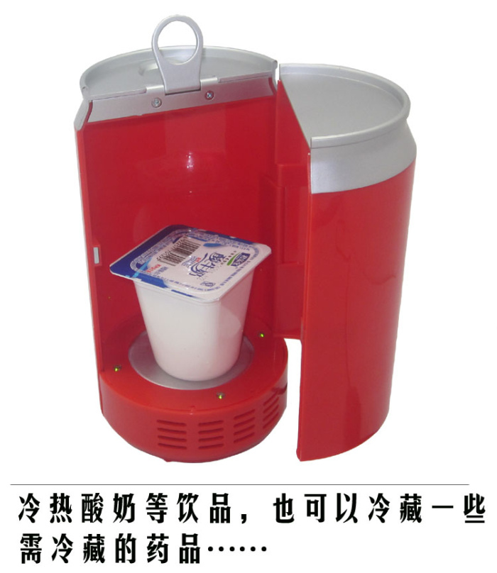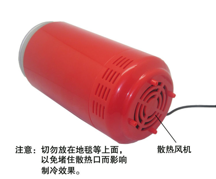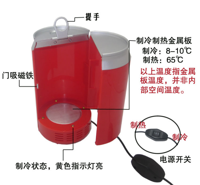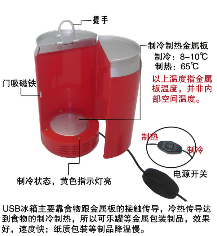 半导体电子制冷片制冷,不含氟利昂,跟我们家用的饮水机制冷原理相同,通过电子制冷片制冷,使冰箱内的金属板迅速降到8.5度,通过冷热传导,达到冷却饮料,所以这款小冰箱对饮料罐的制冷效果是最好的,对于水果等,由于热传导差,冷却效果比较慢,也适合一些需要冷藏保存的药品等。