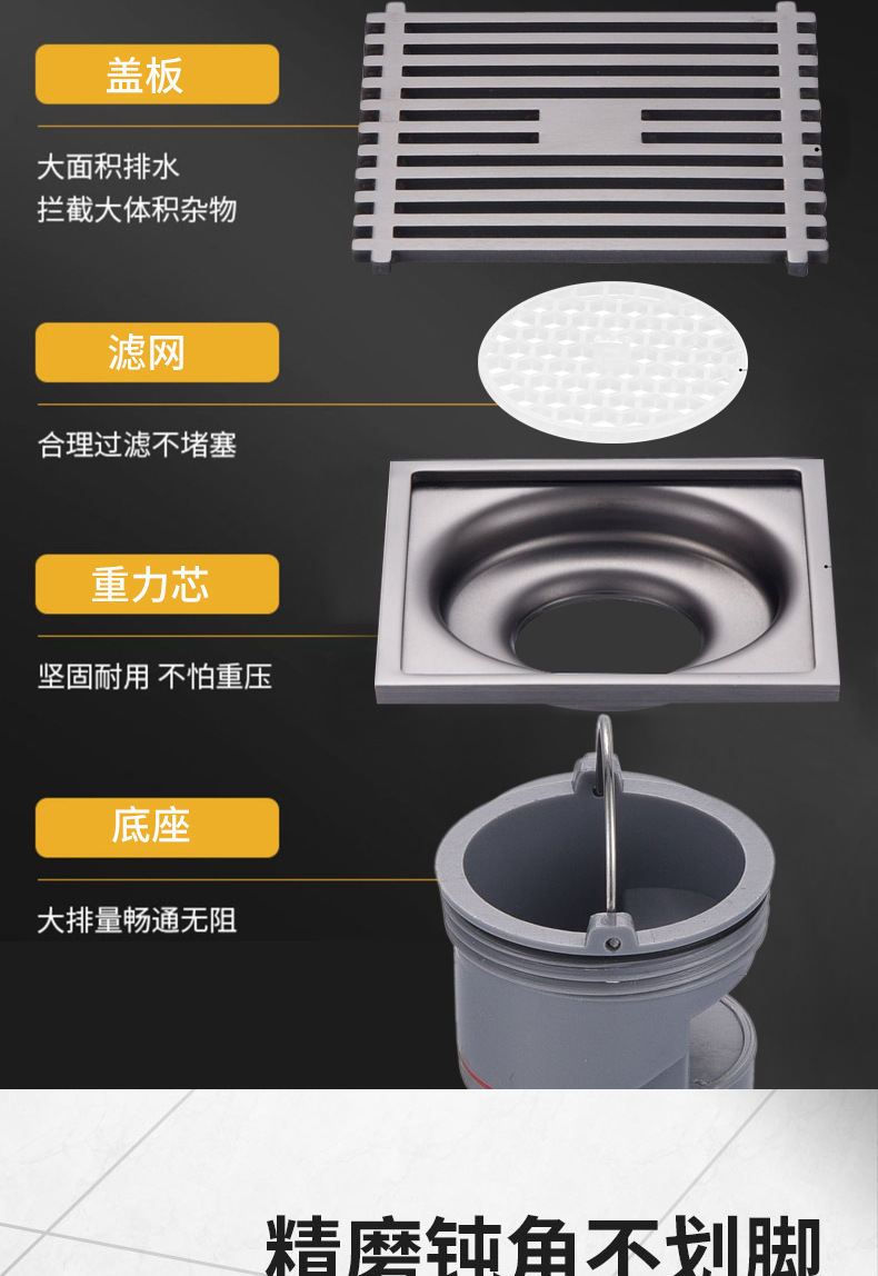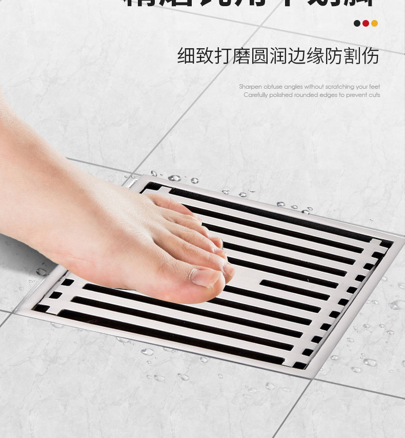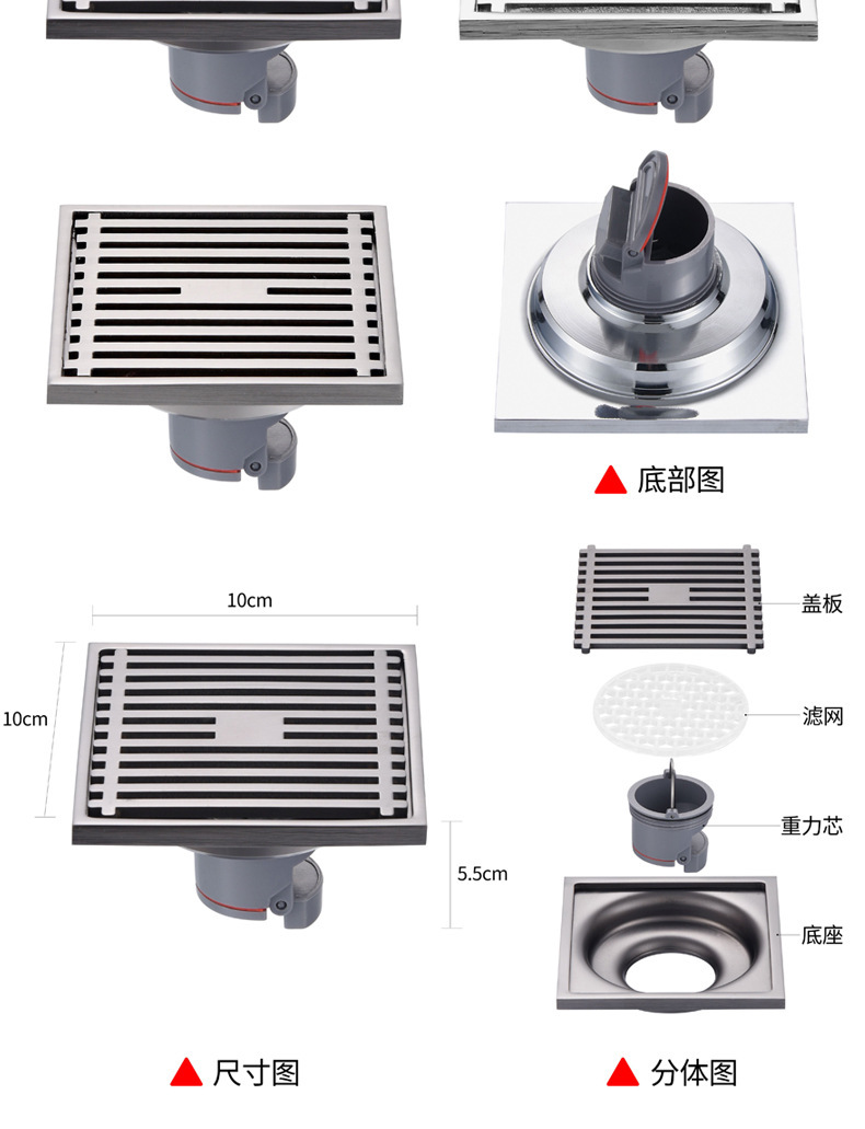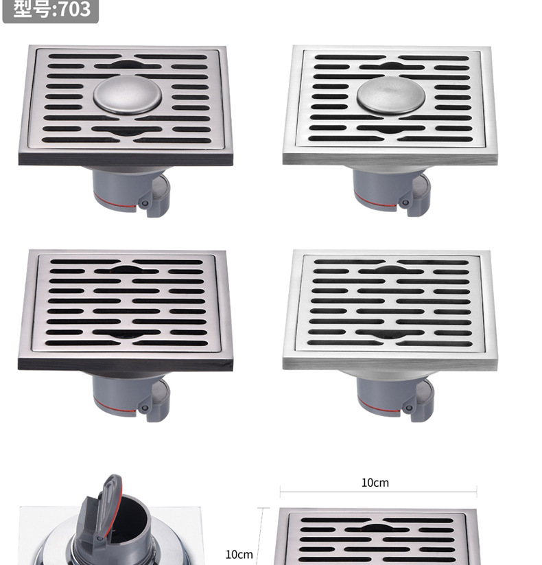 Pistola de drenaje gris de 9 cm, drenaje de suelo de acero inoxidable, drenaje de suelo maloliente, drenaje de suelo cuadrado, Sala de ducha, alcantarillado anti - bloqueo, gran desplazamiento