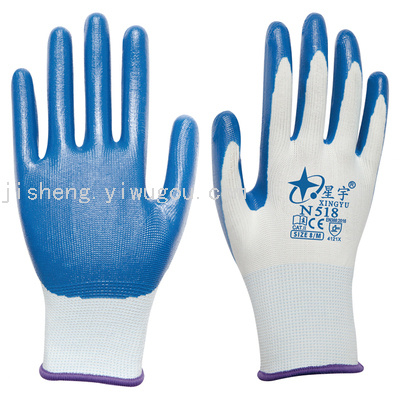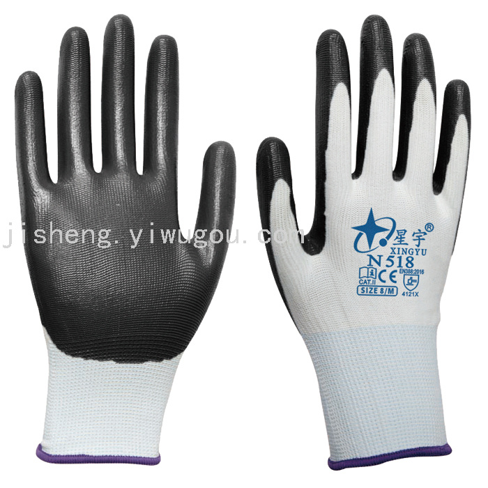 星宇N518N528,奋斗者FN108十三针丁腈手套 【颜色】:如图 【包装】:12双/打(彩袋包装) /960双整袋 【售后】:本品属于消耗品不在三包范围之内 用途:适用于物流,机械制造、造船、治金、林业、港口、矿山、建筑、化工、园艺、电器、消防、装卸等作业场所的手部安全防护、体力较强的职业. 特点:穿着轻便,透气性好、舒适,具有防滑 耐磨、防静电作用.