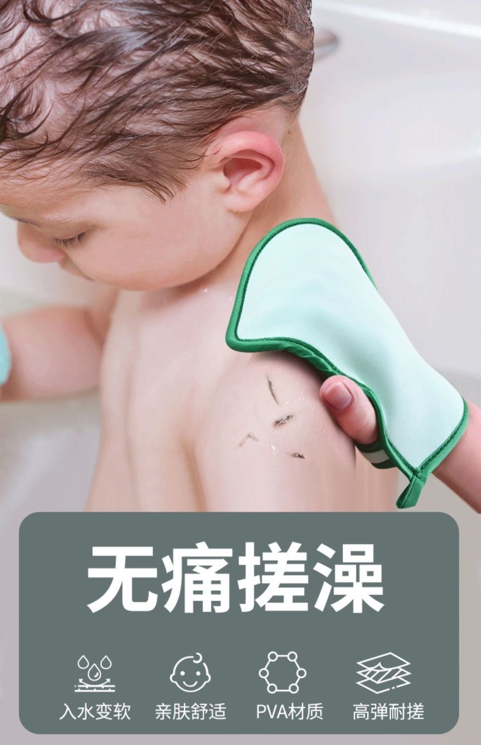 Frota la esponja del baño, frota la toalla del baño, frota los guantes del artefacto de barro doméstico, las niñas indoloras frotan la ceniza, los bebés se bañan y frotan la espalda.