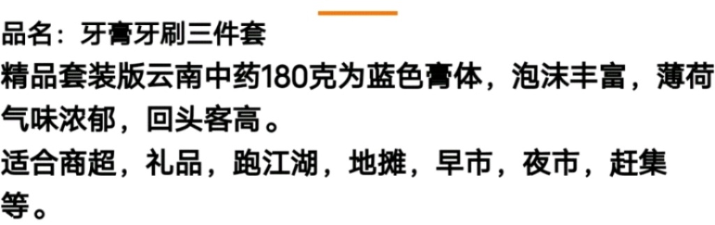 普通版:中药牙膏180克一支+小苏打牙膏110克一支+软毛纤维牙刷5支。金装升级版套餐一:中药牙膏180克一支+小苏打牙膏110一支+软毛纳米牙刷4支。 金装升级版套餐二:中药牙膏180克一支+小苏打牙膏110克一支+软毛纤维牙刷5支。 批发不包邮,下单运费填0,默认发物流(货运)需到县城自提,运费到付,如需快递联系客服咨询运费。此商品不支持退货,因货物来回会对产品造成影响,会影响第二次销售,介意的不要拍!小本生意。 了解更多热销产品添加微信号:18557902555 提醒,云南中药牙膏,改为:云南中草药牙膏,图片不做改动。 ![]() ![]() ![]() ![]() ![]() ![]() ![]() ![]() |