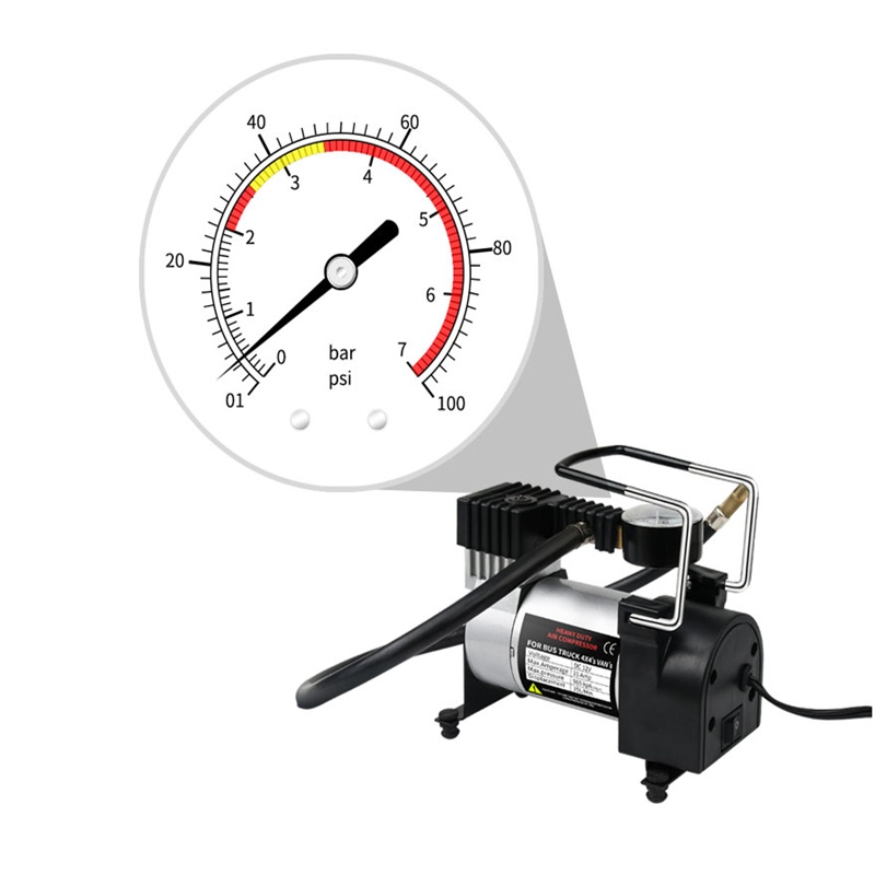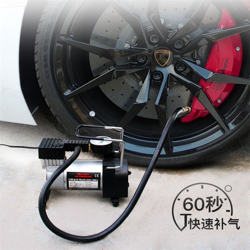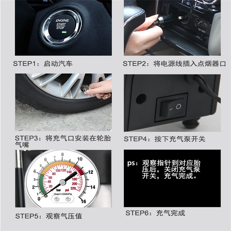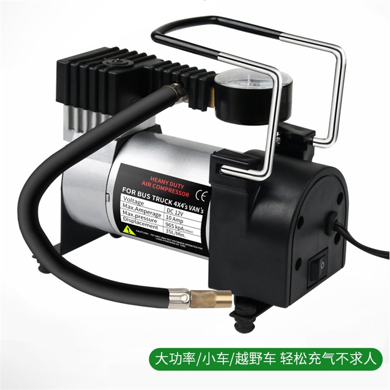 工作电流 :车载电流130w以工作对象 中小型轮胎 【配 件】0.9M的充气软管、三个不同气针(可用于不同的充气对象)、280cm左右的连接线、 说明书、一个彩盒。 【本款优势】 质量上乘,做工精细,质量可靠,经久耐用,美观大方,旅游必备装备 1、超小的振动和噪音 2、防振橡皮脚垫 坚固结实 3、量程为(0--100)PSI压力表(精度更高) 4、自带保护功能,当轮胎充满时电机可自动断电。 5、体积小巧,外形美观。 6、打气速度快,5-7分钟一个完全没气的胎即可充满。 7、减震脚,使用更平稳。 8、附送三种气嘴,自行车,摩托车,球类,充气床也可打气。 主体部分材料:金属 【使用方法】 取出点烟插头,直接插在汽车点烟器上,打开气泵开关,待气泵启动后,将充气软管顶端之气嘴 直接插在轮胎气门上,听到空气由轮胎泄出的声音时,表示空气已经流通,可将气嘴拧紧,即可