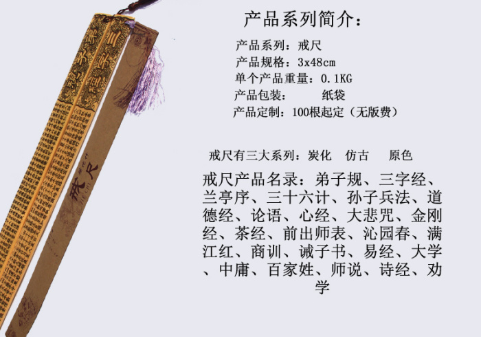 产品名称:竹质戒尺 产品规格:48*3cm 产品工艺:激光雕刻工艺 戒尺的由来