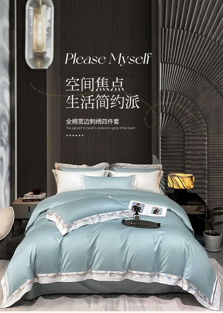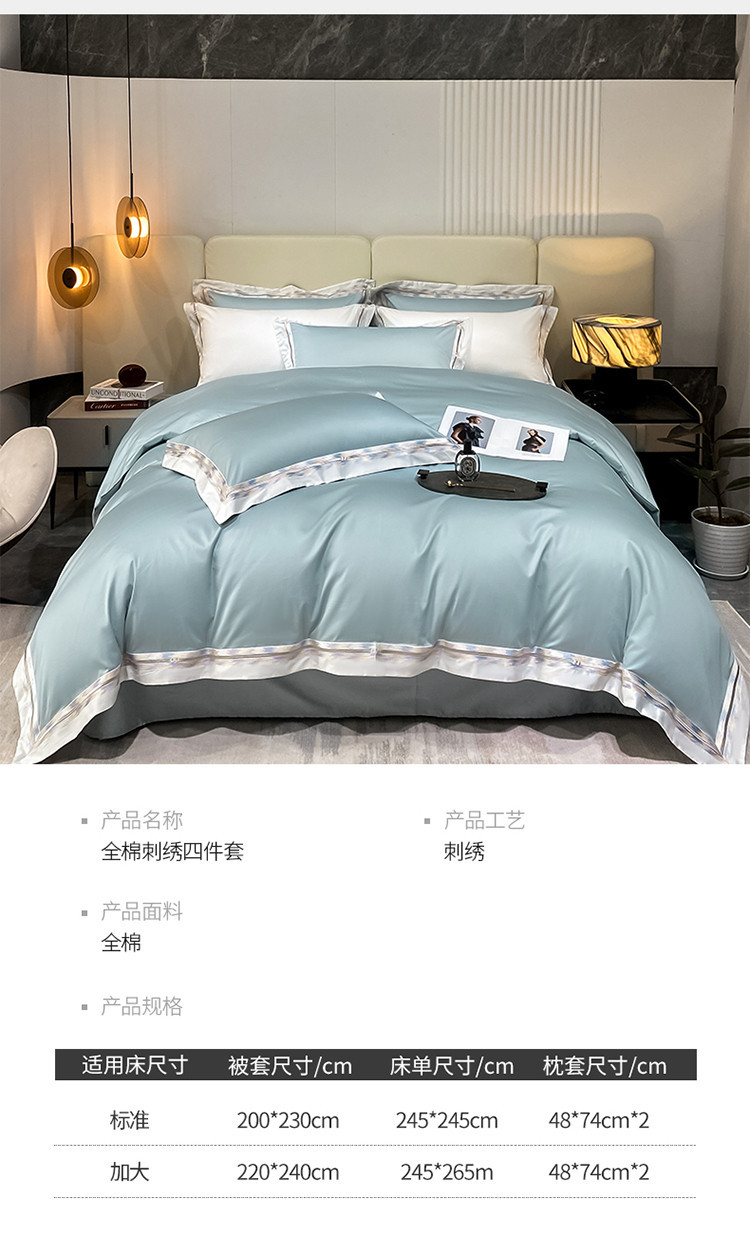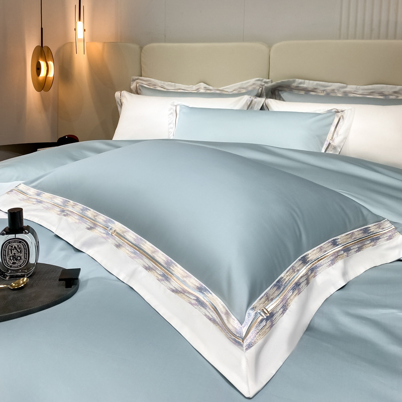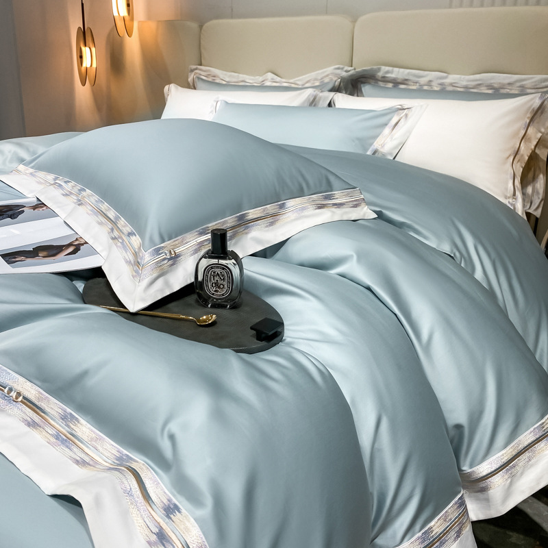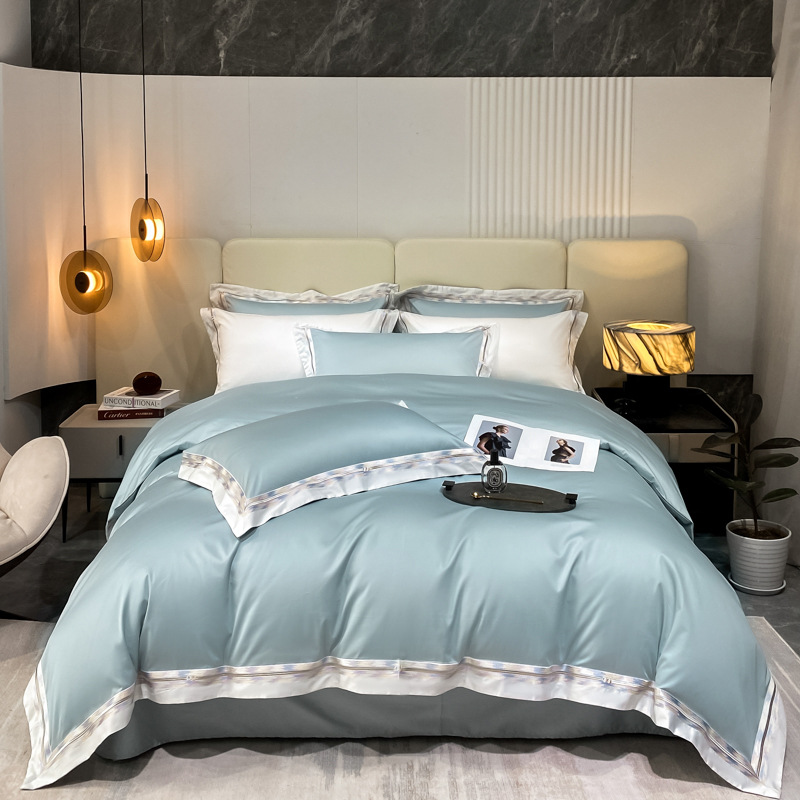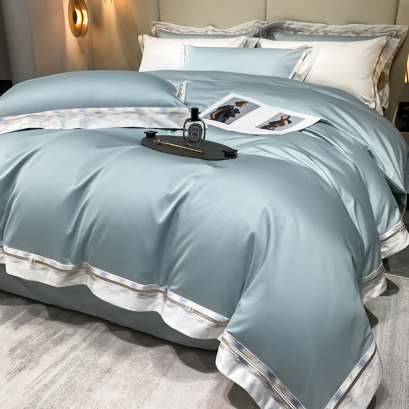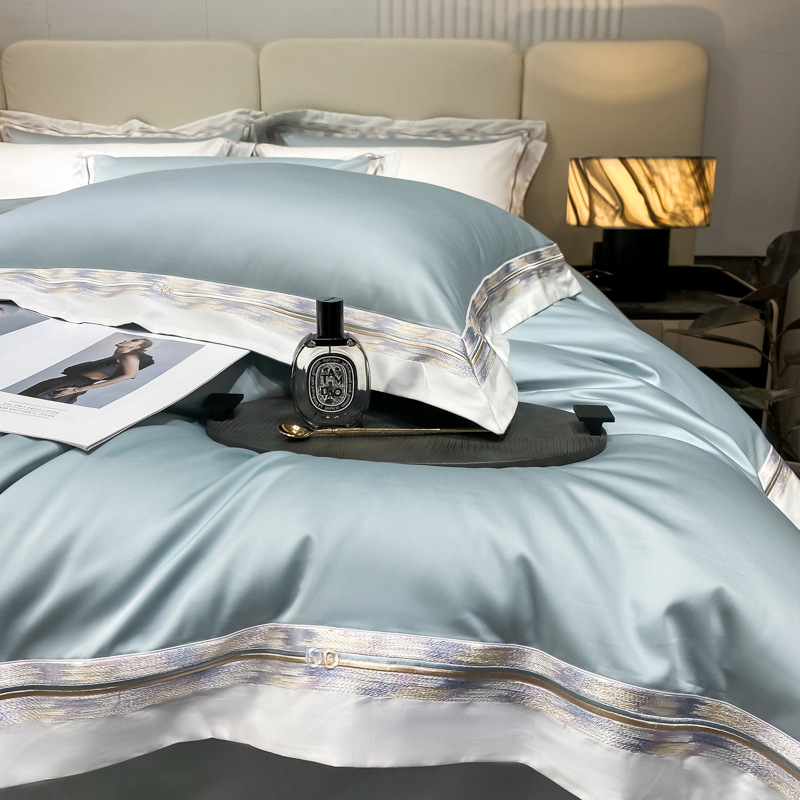 100s color sólido simple bordado de lujo ligero algodón de lana larga juego de cuatro piezas sábanas de cama doble juego de ropa de cama
