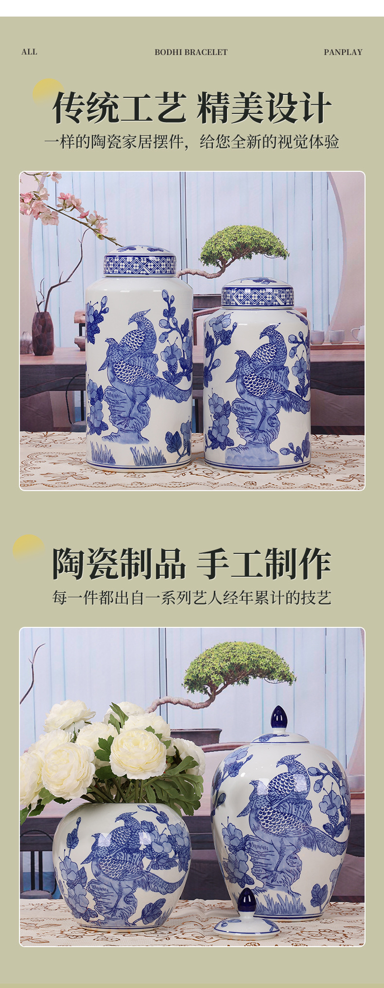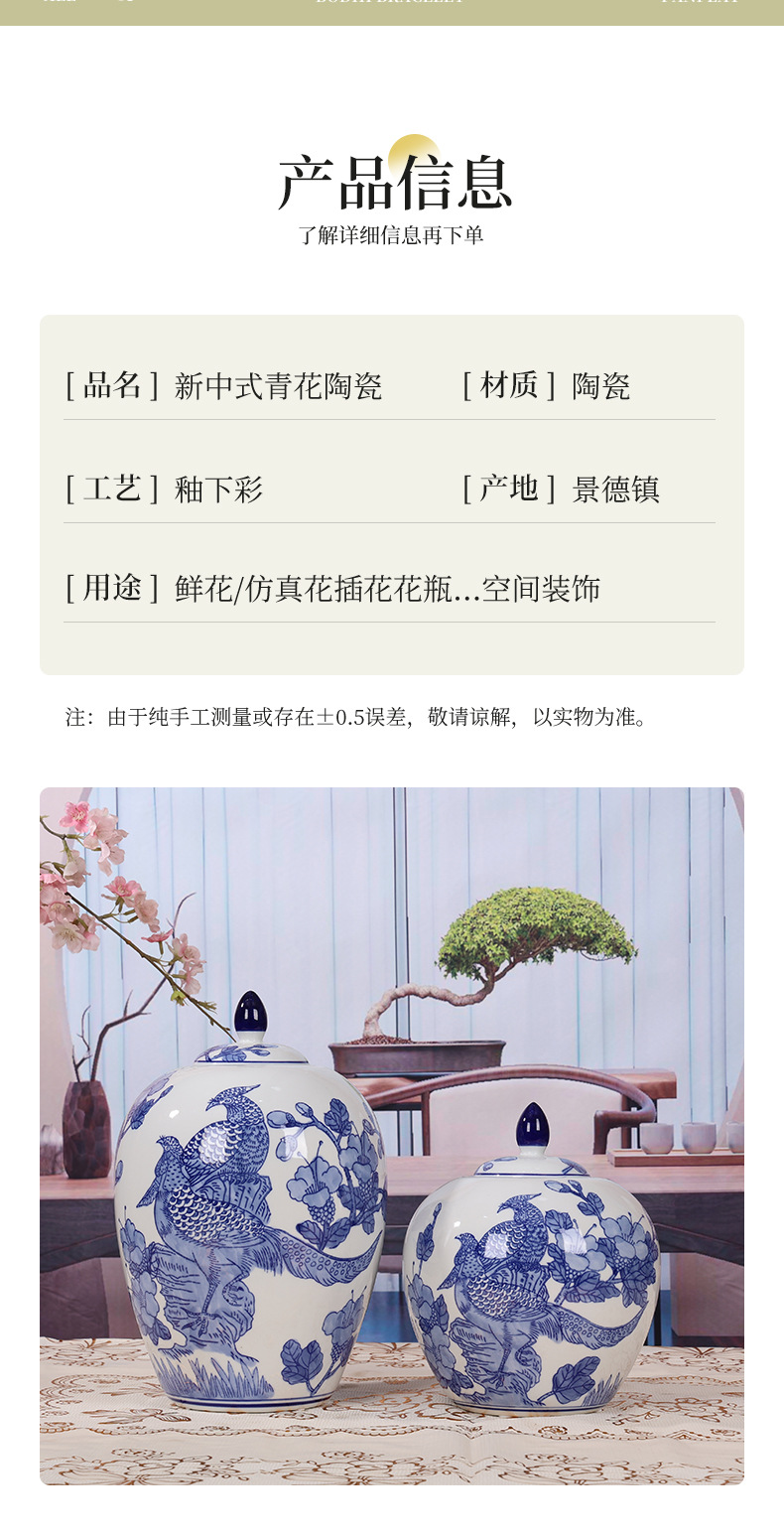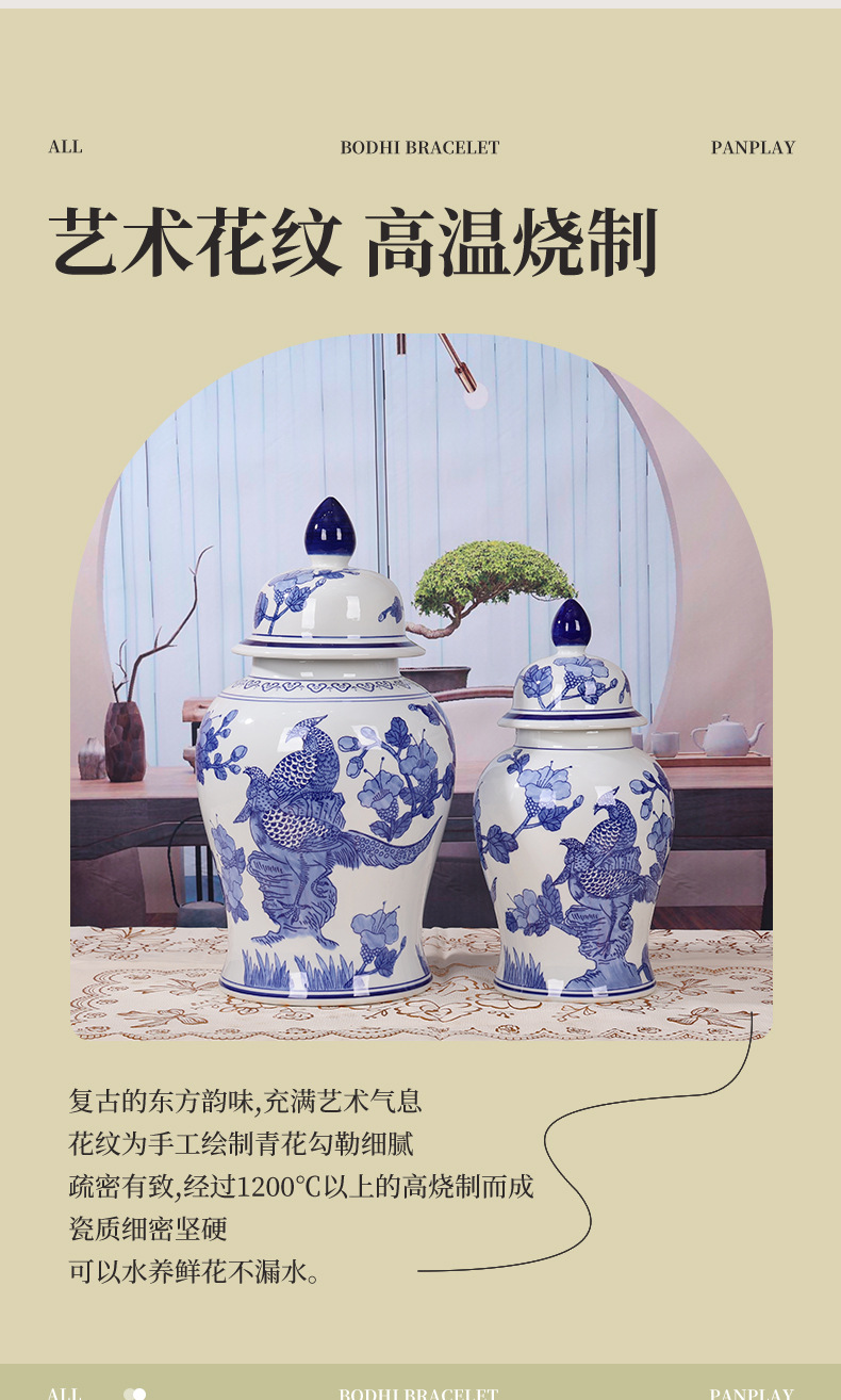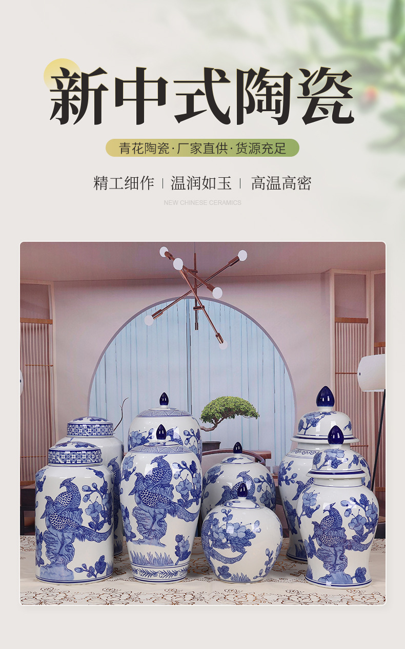 Jingdezhen jinniao jarrón de cerámica azul y blanca jarrón general lata de almacenamiento de latas de té nueva sala de estar China decoración bogu