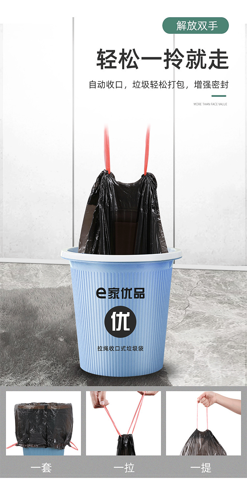 Bolsas de basura portátiles domésticas desechables engrosadas a través de cuerdas para recoger bolsillos, bolsas de basura de bombeo de cuerdas, bolsas de basura de cocina