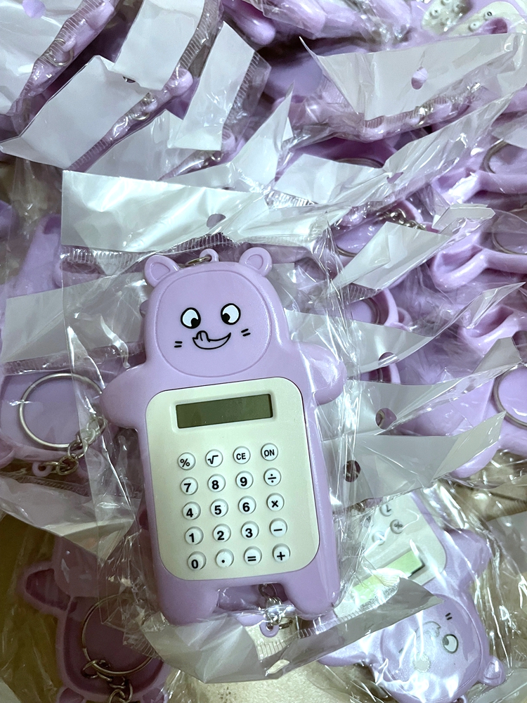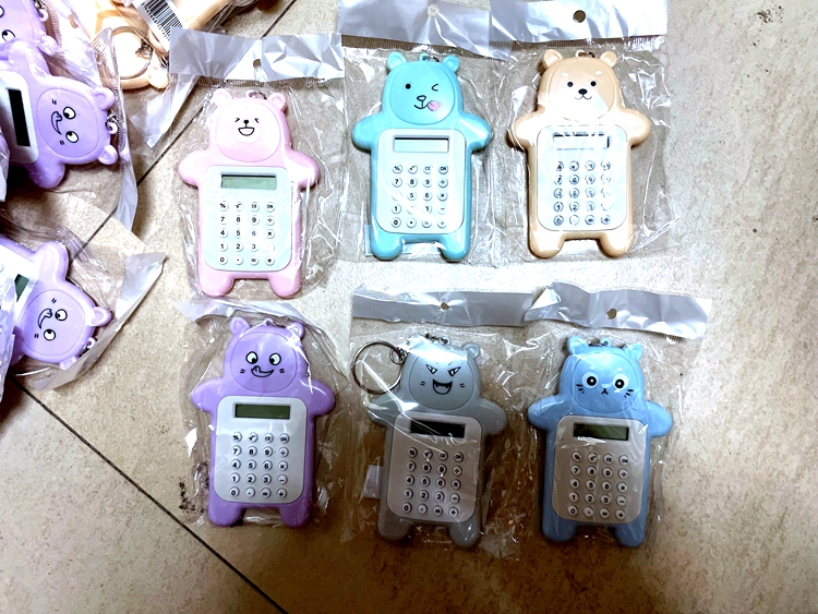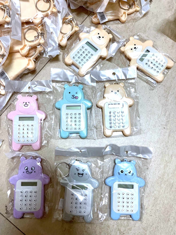 El oso colorido de dibujos animados lleva una calculadora portátil