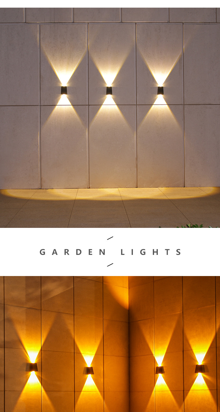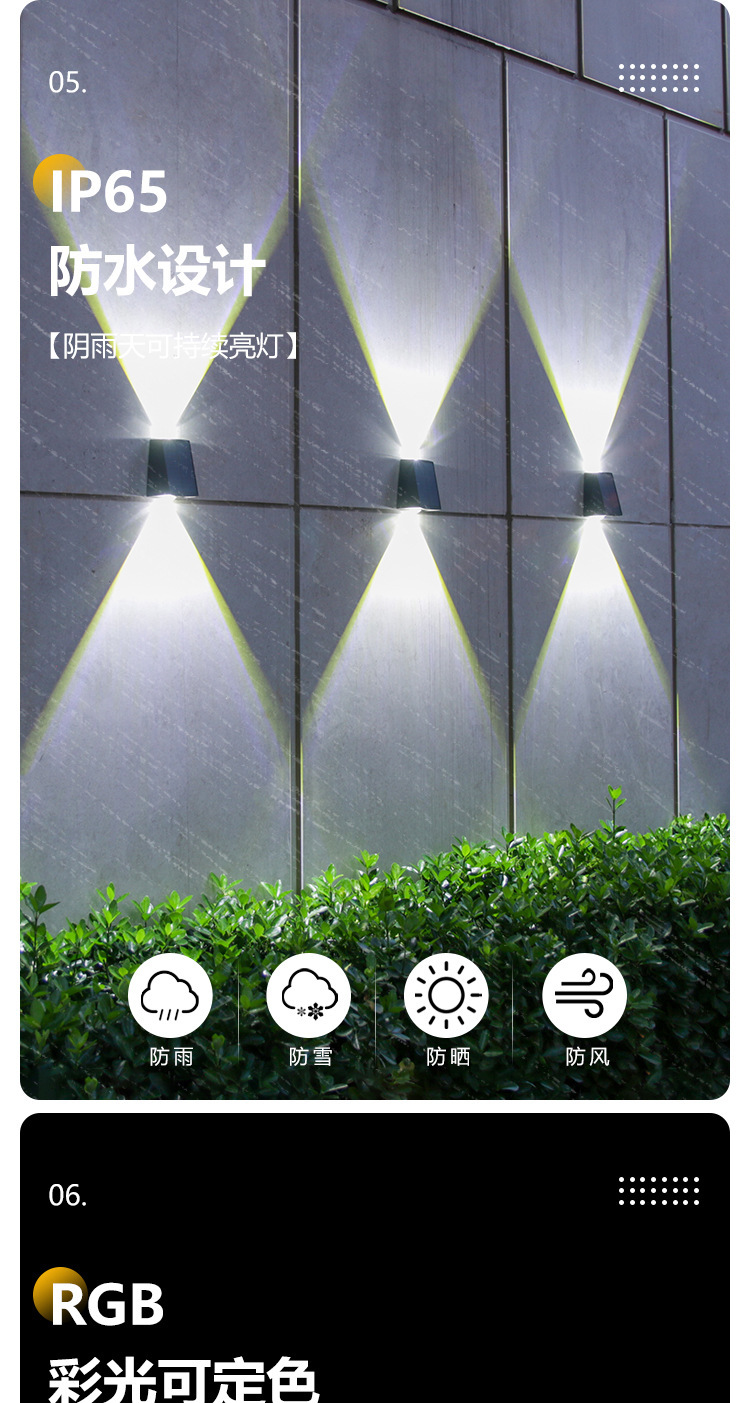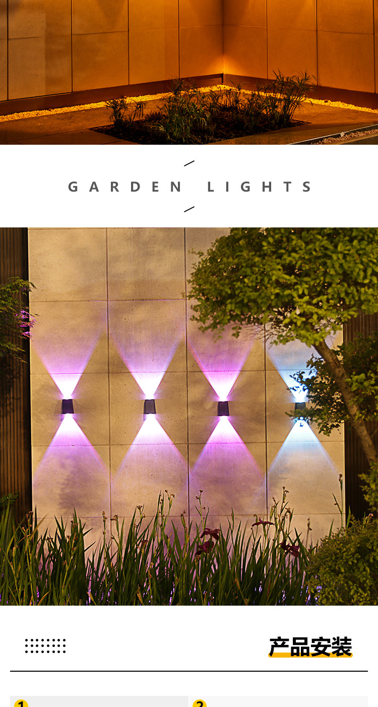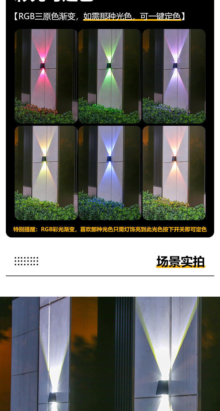 Nuevas luces de pared solares impermeables al aire libre luces de pared exterior luminosas arriba y abajo luces de proyección de doble cabeza convexo Villa lámparas de lavado de pared