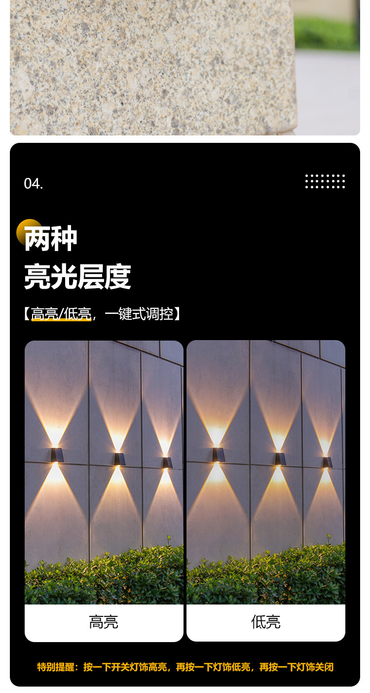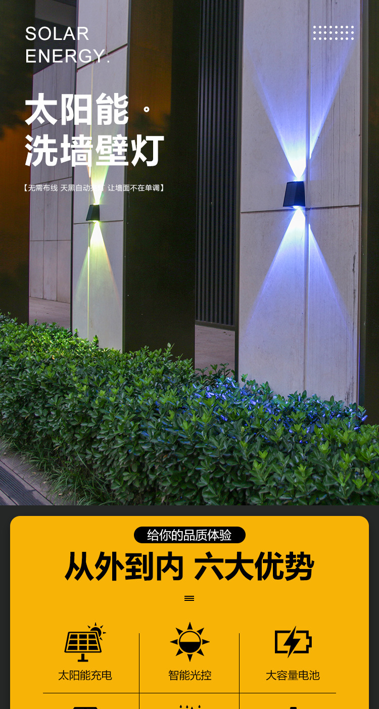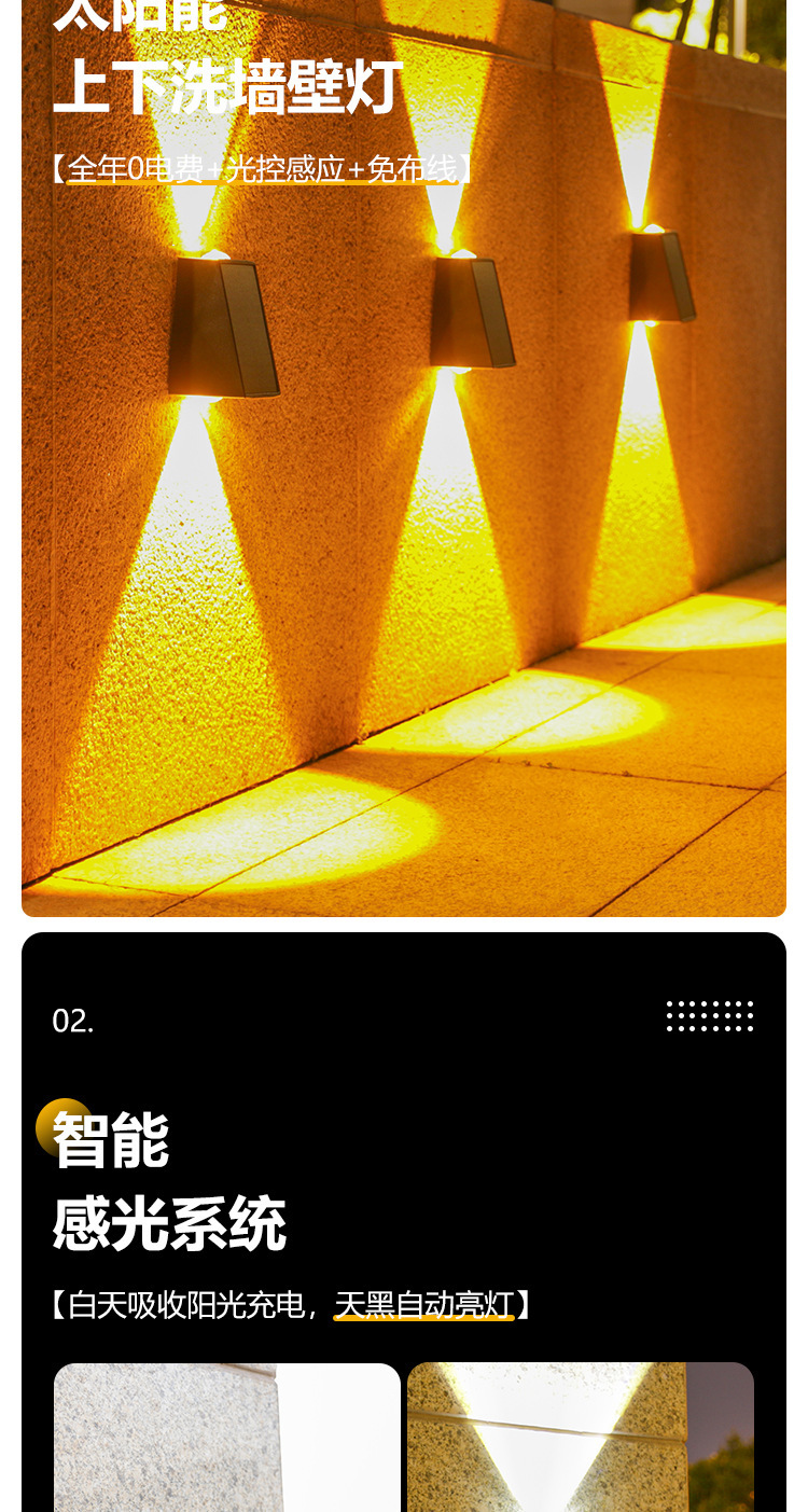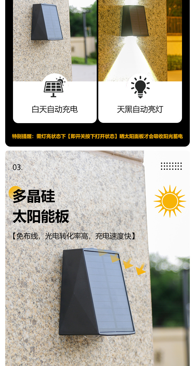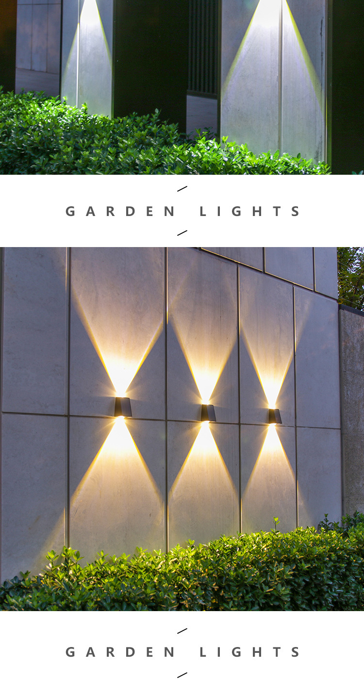 Nuevas luces de pared solares impermeables al aire libre luces de pared exterior luminosas arriba y abajo luces de proyección de doble cabeza convexo Villa lámparas de lavado de pared