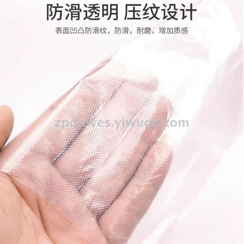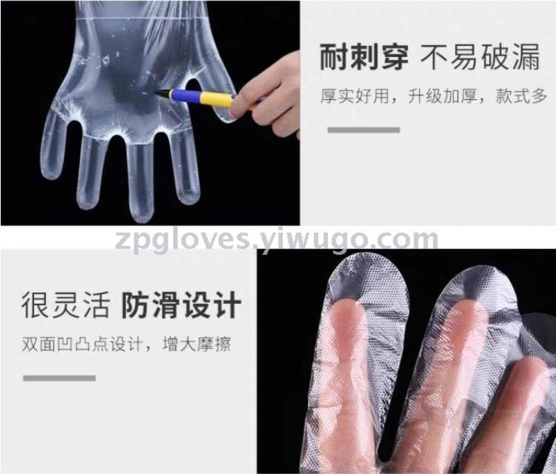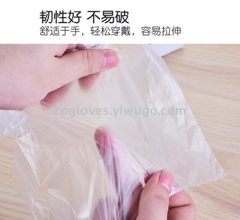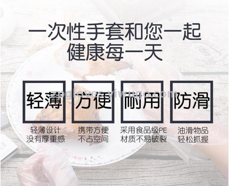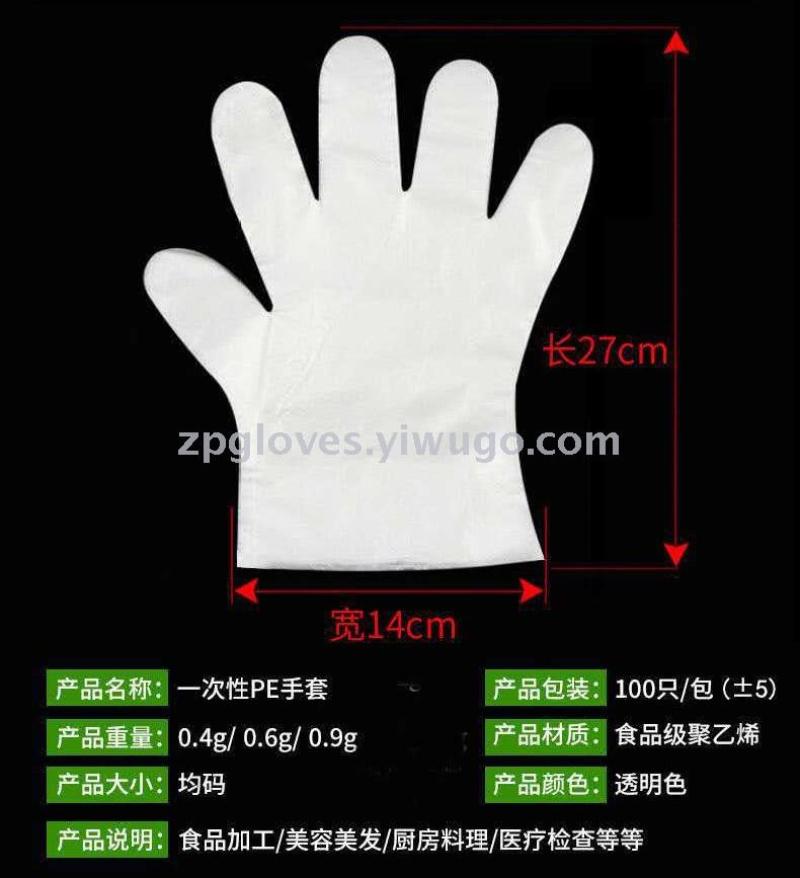 【名称】:一次性手套PE手套100只装 【颜色】:透明 【重量】:0.6g/只、0.8g/只; 【规格】:中指端到开口处长27cm,开口宽14cm 【包装】:100只/包 约正负5只误差,100包/箱,10000只/箱; 【特点】:一次性PE卫生手套,采用食品级无毒无味聚乙烯材料精制而成,韧性强,安全无毒,防尘防污,轻便灵活,加厚设计,不易破漏,方便卫生,免去洗刷的麻烦,简单省事。 【应用广泛】:广泛应用于食品加工、医疗护理、药品配取、厨房料理,家务劳动、发廊染发,居家清洁卫生,美容美发、露营烧烤等用手接触食物时所用,劳动保护等,用途广泛。